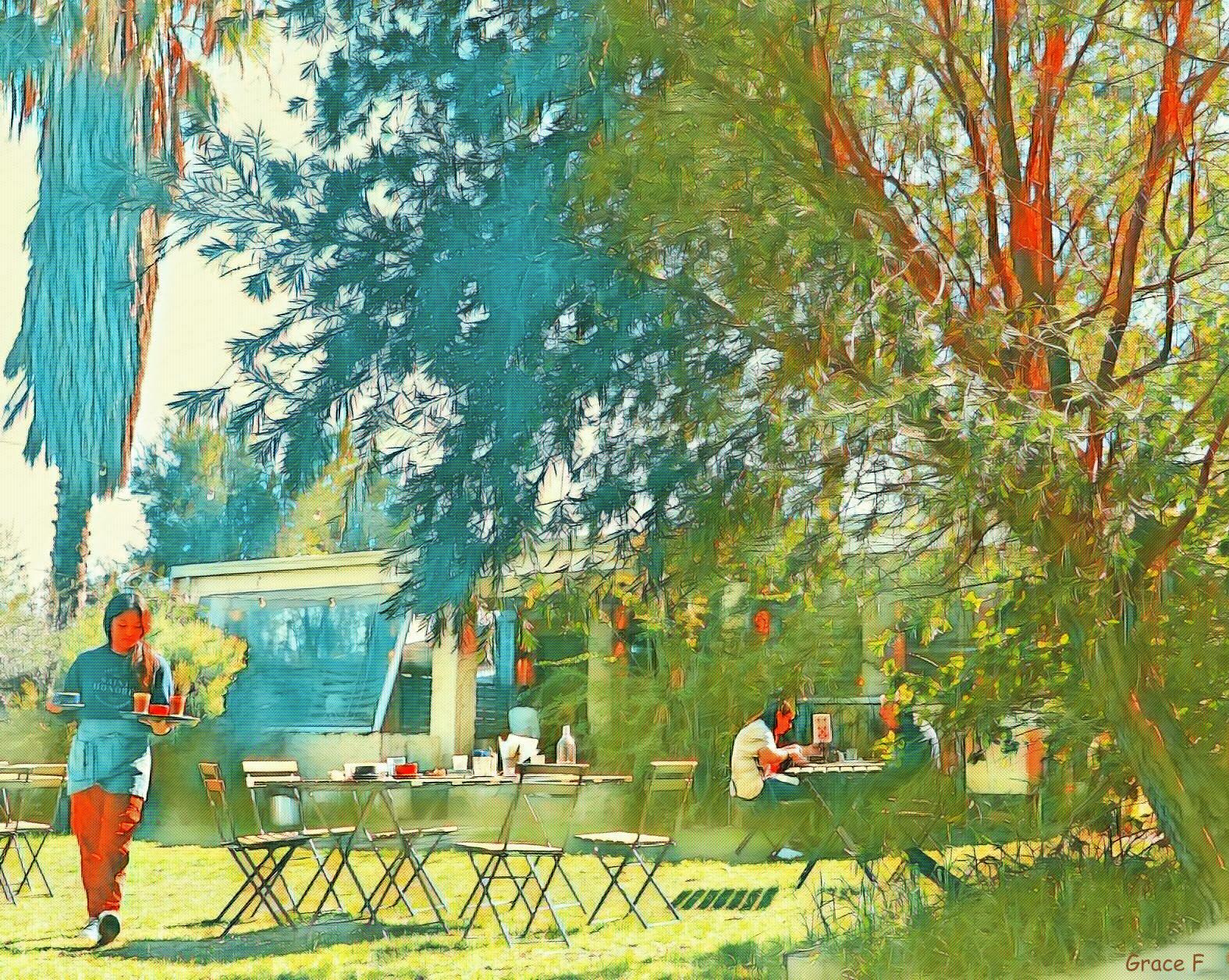 It was mon amie française Marie's birthday yesterday, what better way to celebrate on a beautiful winter's day than brunch under the trees in the gardens of Maison Saint Honore.. did I mention that it is also a macaron factory, a short video to share where we were. I added a painterly touch to the photo that perhaps I shouldn't have :) original below. Happy Thursday, take care and stay safe..